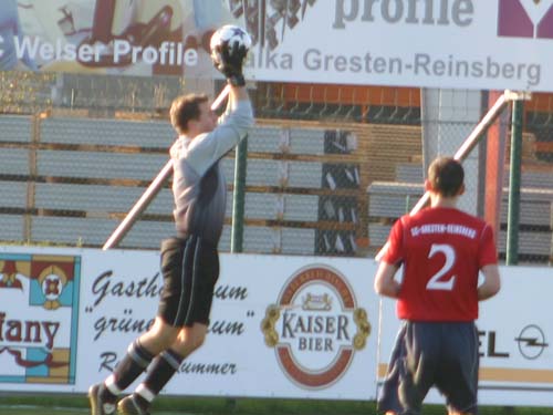 78. Minute: Flanke in den 16er von Gresten. Tormann Rischanek will den Ball über die Cornerlinie lassen. Doch der Stürmer der Böhlerwerker erläuft diesen Ball noch und schießt von der Linie aus spitzen Winkel zum 1:4 ein. eigentlich unmöglich.
