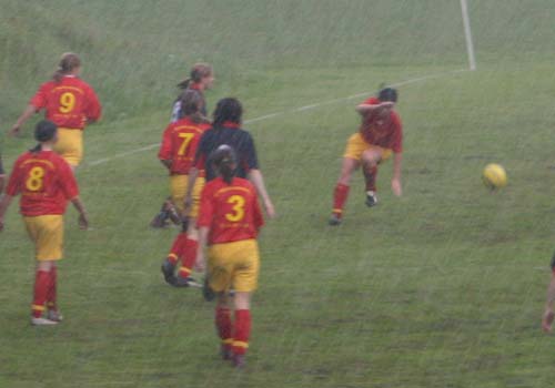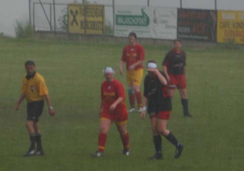 Nach der Pause ändert sich schlagartig das Wetter, starker Regen setzt ein (siehe Fotos), doch beide Mannschaften gaben ihr Bestes und kämpften bei diesen widrigen Verhältnissen um jeden Ball. Scheinbar macht es den Damen Spaß bei diesen Verhältnissen zu spielen den kein Team gab auf oder beklagte sich.