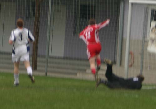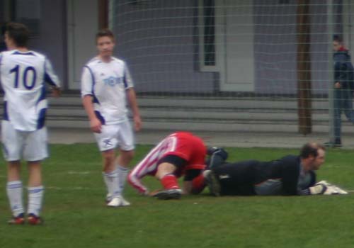Angekurbelt von ihrem Spielmacher, mit dem Wind im Rücken und dem, noch immer mit der Abseitsregel kämpfenden Schiedsrichter auf ihrer Seite, verpasste uns der Gegner einen Genickschlag nach dem Anderen und erzielte 4 Tore. Das Interessante daran ist nun die Frage nach dem wie! Trotz eines wild mit der Fahne wedelnden Linienrichters, der aus den Reihen des Gegners rekrutiert wurde, machte der Referee keine Anstalten die sich deutlich im Abseits befindenen Angreifer zurückzupfeifen. Er ließ sie gewähren und verhalf dem Gegner somit zu einem mehr als schmeichelhaften und in dieser Höhe völlig unverdienten 4:0 Sieg. 3 dieser 4 Tore wurden mit absoluter Sicherheit von sich im Abseits befindenen Spielern erzielt, lediglich eines war regelkonform. Abgesehen von den erzielten Toren, vermochten die Gegner jedoch nie gefährlich zu werden, es bedurfte eben der Nichtexekution der Abseitsregel um vors Tor zu kommen.