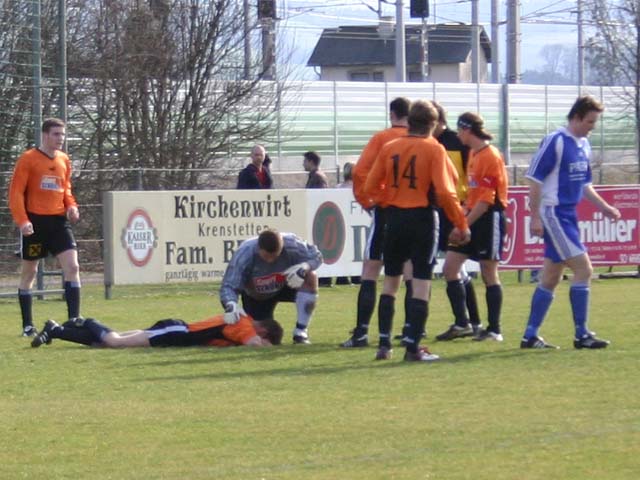 20. Minute: Erste Möglichkeit für Gresten. Ecke für Gresten, der alles andere als sicher wirkende Goalie lässt den Ball aus. Franz Tanzer, der engagierte Debütant, kann den Ball nicht über die Linie drücken.