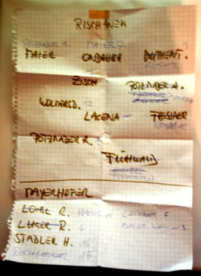 Zur Veranschaulichung der Personalprobleme ein Bild: Es zeigt die ursprünglich geplante Aufstellung, mit Kugelschreiber musste der Trainerstab jedoch nach und nach neue Namen ins Treffen führen.