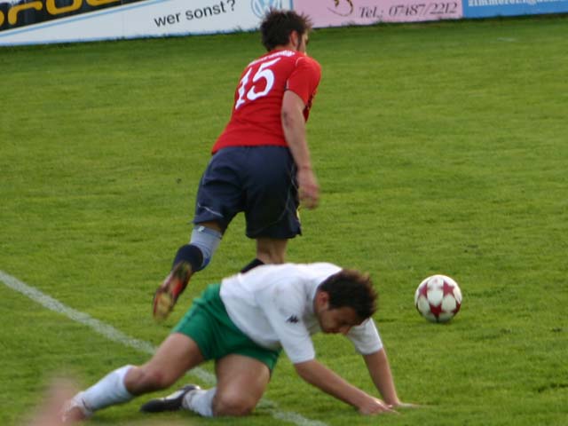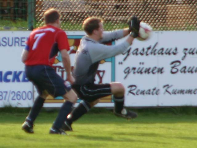 90. Minute: Schrecksekunde kurz vor dem Abpfiff. Gottseidank bringt der Neumarkter Stürmer den Ball nicht unter Kontrolle, "Rischi" klärt.