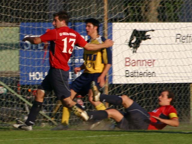 18. Minute: Doch dann kommt Gresten immer besser ins Spiel, Franz Tanzer köpfelt gefährlich. Der Ball wird gerade noch auf der Linie abgewehrt.
